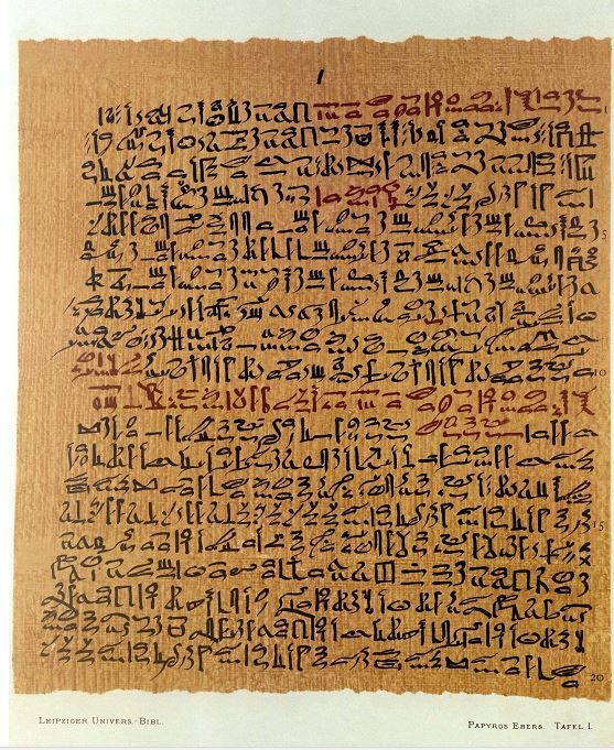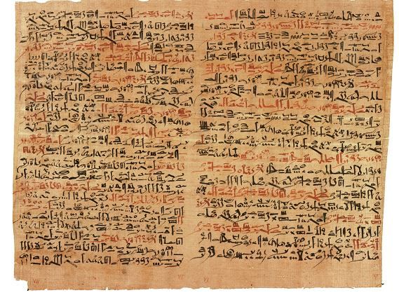 هذه صورة لجزء من بردية إيبرس، وهي أشبه بموسوعة طبية شاملة تحتوي على مئات الوصفات والعلاجات لمجموعة واسعة من الأمراض الباطنية والجلدية وغيرها.