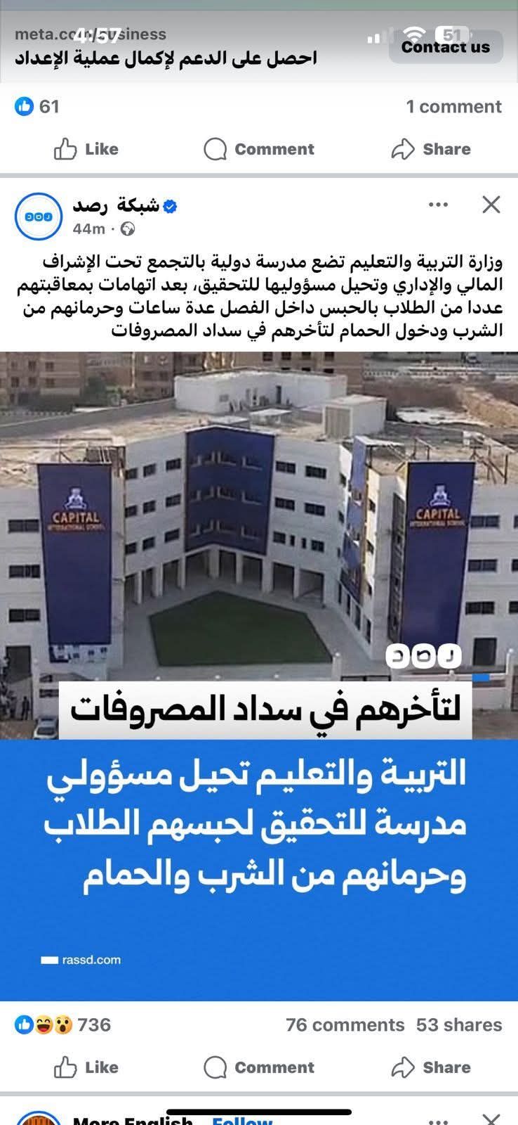 وأشارت الإدارة إلى أن مدارس كابيتال بأكتوبر لا تمت بصلة من قريب أو بعيد بالمدرسة المشار إليها في الخبر، كما أنه لا توجد لها أي فروع في مناطق التجمع أو القاهرة الجديدة.