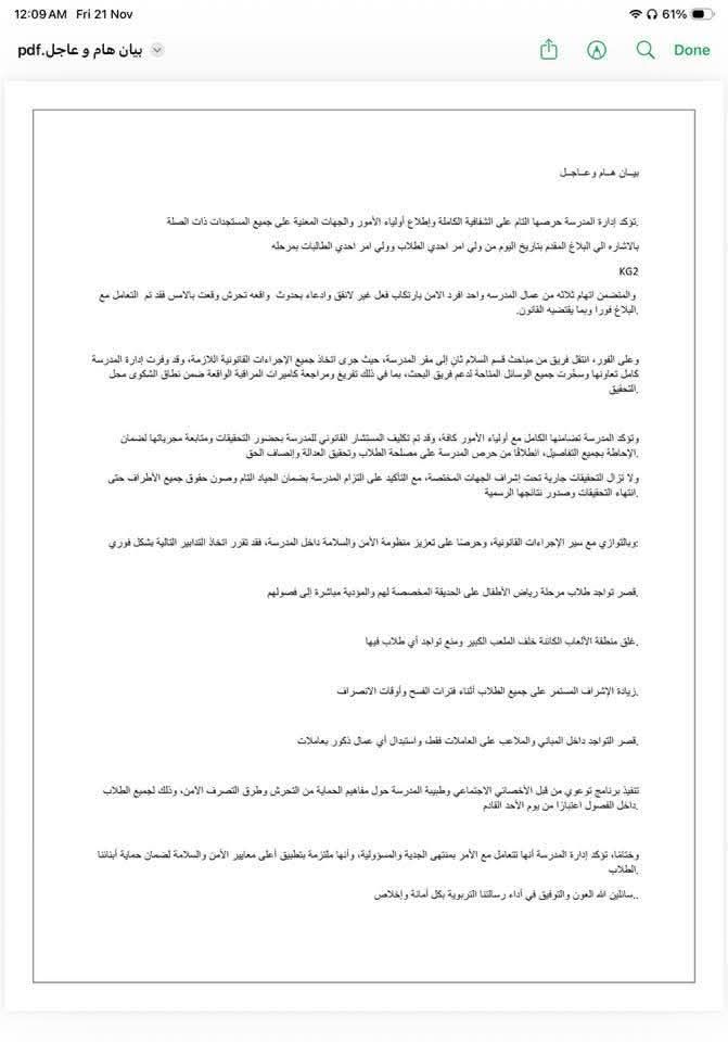 وأضافت أن التحقيقات لا تزال جارية تحت إشراف الجهات المختصة، مع التشديد على التزام المدرسة بالحياد التام وصون حقوق جميع الأطراف حتى انتهاء التحقيقات وصدور نتائجها الرسمية.