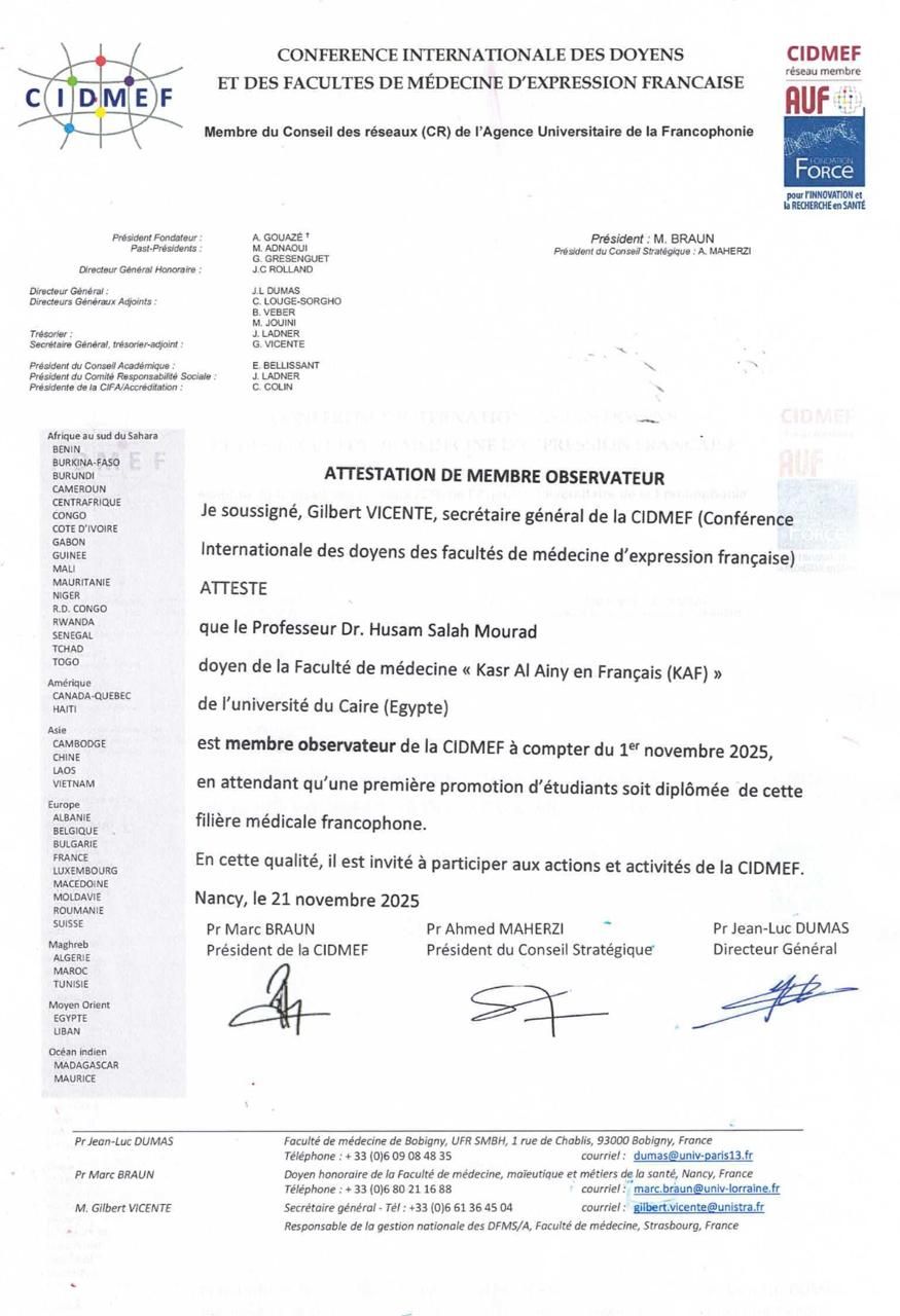 ويُعد هذا الانضمام خطوة نوعية تسهم في دعم التواصل العلمي والبحثي بين كلية الطب جامعة القاهرة ونظيراتها في الدول الناطقة بالفرنسية، بما يتيح تبادل الخبرات الأكاديمية وتطوير آفاق التعاون في مجال التعليم الطبي والتدريب والبحث العلمي. كما يُمهّد الطريق نحو اعتراف دولي أوسع بالبرنامج الفرنسي الجديد واعتماده ضمن منظومة التعليم الفرانكوفوني العالمي.