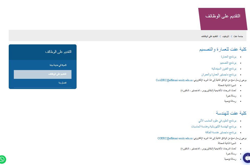 تركز جامعة عفت من خلال هذه الوظائف على تعزيز كوادرها التعليمية والإدارية في الكليات الأربع الرئيسة وهي: كلية العمارة والتصميم، كلية الهندسة، كلية العلوم الإنسانية، وكلية الأعمال، إضافة إلى برنامج التعليم العام، وعدد من الإدارات والوحدات الداعمة داخل الجامعة. ويُشترط على المتقدمين إرسال المستندات المطلوبة التي تشمل السيرة الذاتية المحدثة، ونسخًا من الدرجات الأكاديمية (البكالوريوس، الماجستير، الدكتوراه)، ورسائل الخبرة والتوصية إلى البريد الإلكتروني المخصص لكل كلية أو وحدة إدارية.
