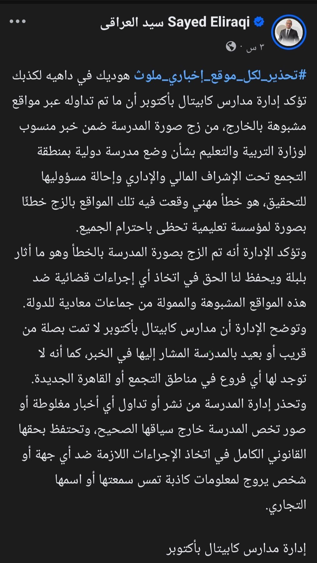 أوضحت إدارة مدارس كابيتال بأكتوبر أن ما تم تداوله عبر عدة مواقع، من زج صورة المدرسة ضمن خبر منسوب لوزارة التربية والتعليم بشأن وضع مدرسة دولية بمنطقة التجمع تحت الإشراف المالي والإداري وإحالة مسؤوليها للتحقيق، هو خطأ مهني وقعت فيه تلك المواقع بالزج خطئًا بصورة لمؤسسة تعليمية تحظى باحترام الجميع.