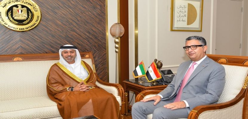 جاء ذلك خلال لقاء وزير التموين والتجارة الداخلية، اليوم الخميس، مع السفير حمد عبيد الزعابي، سفير دولة الإمارات العربية المتحدة لدى جمهورية مصر العربية، ومندوبها الدائم لدى جامعة الدول العربية، بمكتبه بمقر الوزارة بالعاصمة الجديدة.