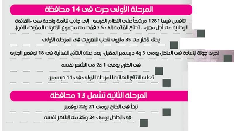 اختتمت مصر المرحلة الأولى من انتخابات مجلس النواب بعد يومين من التصويت المكثف فى 14 محافظة، وشهدت الأجواء منافسات ساخنة ومشاركة وصفتها الهيئة الوطنية للانتخابات بـ«المرتفعة والمرضية»، بينما عكست نتائج الفرز الأولية مشهدًا سياسيًا يميل نحو استقرار القوى التقليدية وهيمنتها على أغلبية المقاعد مع بروز مفاجآت محدودة فى بعض الدوائر التى تتجه لجولة إعادة وُصفت بأنها ستكون «الأكثر سخونة»، خاصة فى محافظات الوجه القبلى.