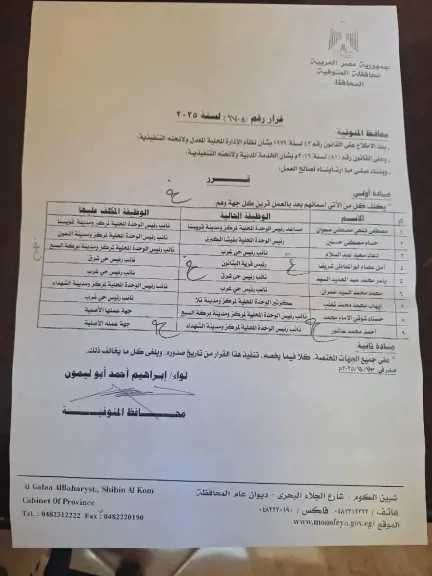 وكذلك عودة أحمد محمد عاشور من نائب رئيس الوحدة المحلية لمركز ومدينة الشهداء الي جهة عمله الاصلية.