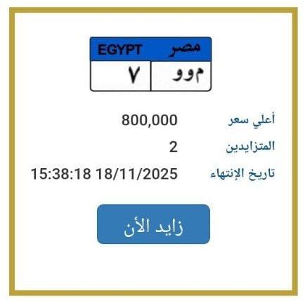 أعلنت بوابة مرور مصر الإلكترونية، المزايدة على لوحة معدنية مميزة للسيارات، وصل سعرها إلى 800 ألف جنيه، وتحمل رقم «م و و 7»، ويتزايد عليها حتى الآن شخصين، ومن المقرر أن تنتهي المزايدة عليها يوم الثلاثاء الموافق 18 نوفمبر 2025.