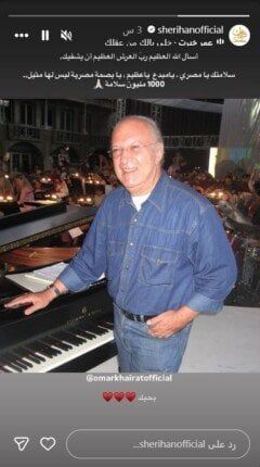 وشاركت شريهان متابعيها بـ «إنستجرام» صورة للموسيقار عمر خيرت، وكتبت: «أسأل الله العظيم رب العرش العظيم أن يشفيك، سلامتك يا مصري، يا مبدع، يا عظيم، يا بسمة مصرية ليس لها مثيل 1000 مليون سلامة».