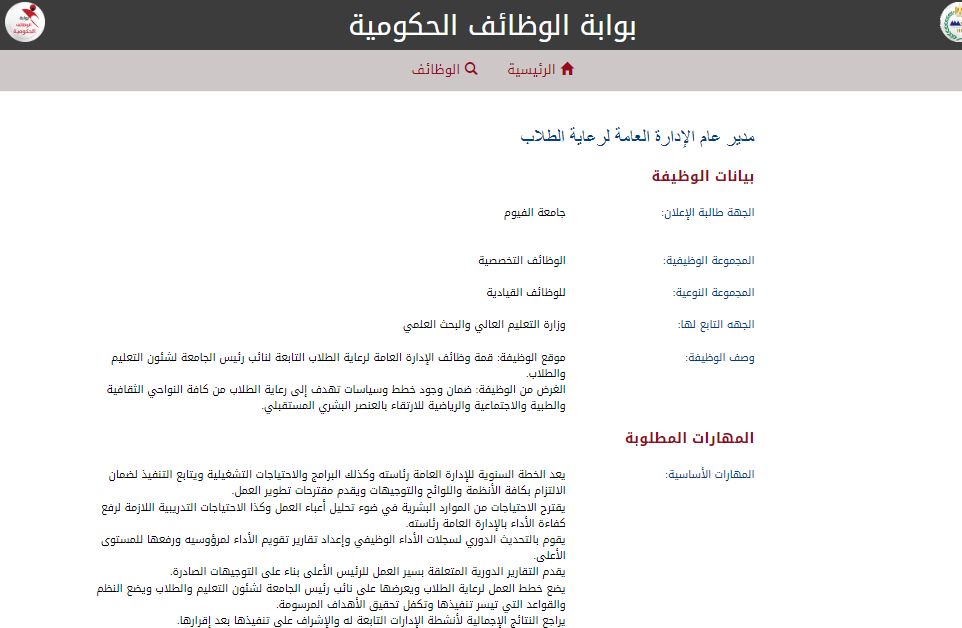 وظيفة جامعة.. أعلنت جامعة الفيوم، تحت إشراف وزارة التعليم العالي والبحث العلمي، عن حاجتها لشغل وظيفة مدير عام الإدارة العامة لرعاية الطلاب، وهي إحدى الوظائف القيادية المهمة داخل منظومة الجامعة.