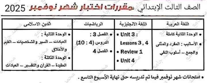 أعلنت مديرية التربية والتعليم بجميع محافظات جمهورية مصر العربية عن مقررات اختبار شهر نوفمبر، والذي سوف يتم عقده خلال الأسبوع المقبل، لطلاب وطالبات الصف الثالث الابتدائي، في كافة مدارس الجمهورية.