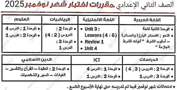 الصف الثاني الإعدادي مقررات اختبار شهر نوفمبر 2025