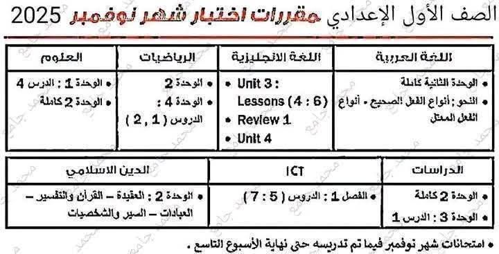 الصف الأول الإعدادي مقررات اختبار شهر نوفمبر 2025