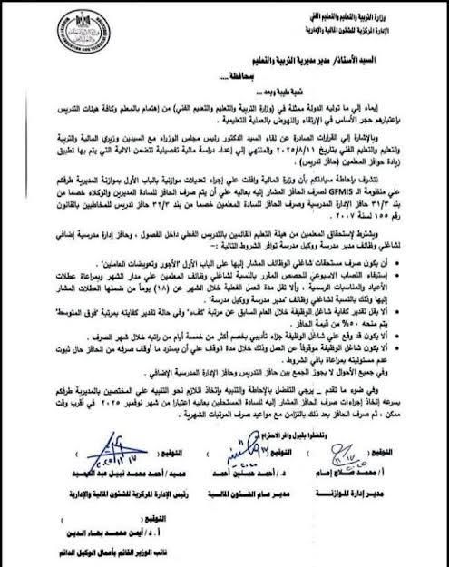 ونص الخطاب على أن وزارة المالية وافقت علي إجراء تعديلات بالباب الأول بموازنة المديريات التعليمية علي منظومة الـ GFMIS لصرف حافز الـ 1000 جنيه للمعلمين علي أن يتم صرف الحافز للسادة المديرين والوكلاء خصما من بند ۳۱/۳ حافز الإدارة المدرسية وصرف الحافز للمعلمين خصما من بند ۳۲/۳ حافز تدريس للمخاطبين بالقانون رقم ١٥٥ لسنة ٢٠٠٧.