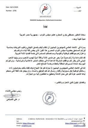 وأضاف الاتحاد العالمي للمهاجرين اليمنيين: «لقد كنتم دائمًا ولا زلتم صوتًا حرًا يعبر عن ضمير الأمة وناقلا أمينا لهموم الشعوب ومن بينها الشعب اليمني الذي يقدر لكم مواقفكم المشرفة الداعمة له في مختلف المنابر الإعلامية والبرلمانية، وإن فوزكم اليوم يعد امتدادًا لمسيرتكم الحافلة بالعطاء وخدمة الصالح العام».