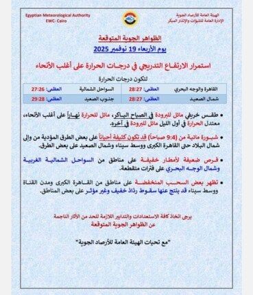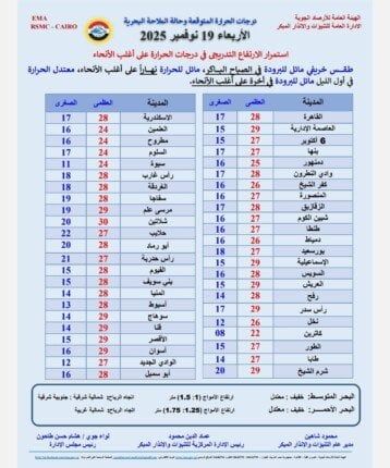 وفيما يلي بيان بدرجات الحرارة المتوقعة اليوم على محافظات ومدن مصر:
