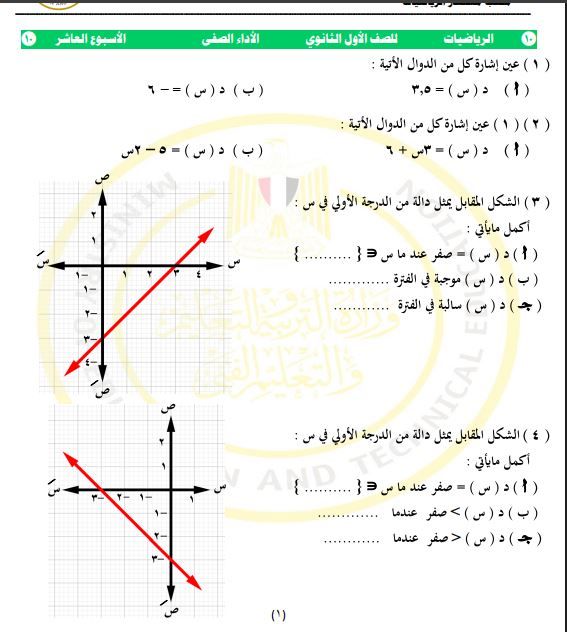 أسئلة تقييم الأسبوع العاشر الرياضيات أولى ثانوي
