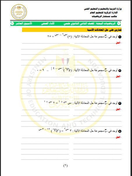 أسئلة تقييم الأسبوع العاشر الرياضيات البحتة ثانية ثانوي