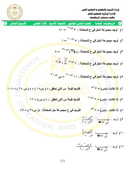 مراجعات نهائية.. أسئلة تقييم الأسبوع العاشر الرياضيات البحتة الصف الثاني الثانوي