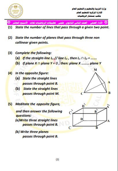 أسئلة تقييم الأسبوع العاشر الرياضيات العامة لغات الصف الثاني الثانوي