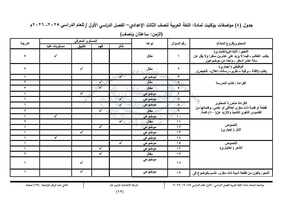 مواصفات امتحان اللغة العربية للشهادة الإعدادية الفصل الدراسي الأول 2026