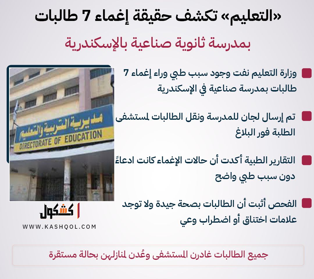 - وزارة التعليم نفت وجود سبب طبي وراء إغماء 7 طالبات بمدرسة صناعية في الإسكندرية