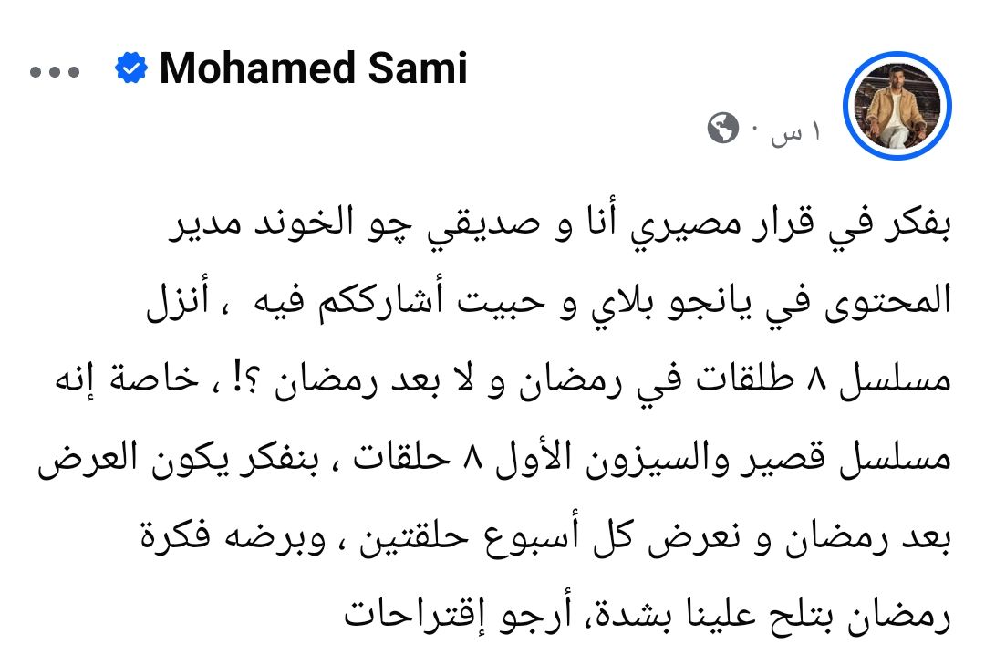 وكتب محمد سامي، عبر حسابه الشخصي بموقع التواصل الاجتماعي فيسبوك: “بفكر في قرار مصيري أنا وصديقي چو الخوند مدير المحتوى في يانجو بلاي وحبيت أشارككم فيه، أنزل مسلسل 8 طلقات في رمضان ولا بعد رمضان ؟!، خاصة إنه مسلسل قصير والسيزون الأول 8 حلقات”.