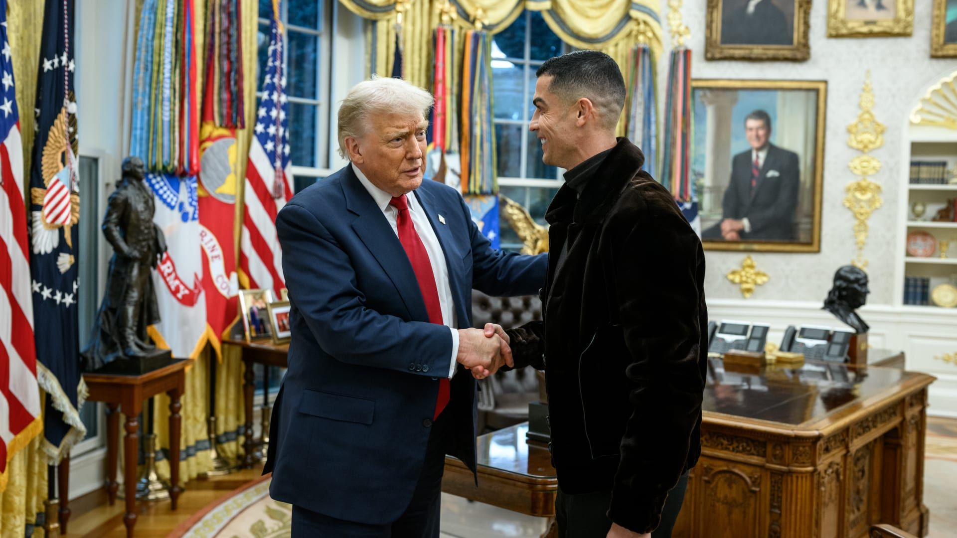 وأظهرت لقطة علامات السعادة على كريستيانو رونالدو خلال حديثه مع دونالد ترامب، وبيّنت لقطة أخرى مصافحة الثنائي لبعضهما البعض.