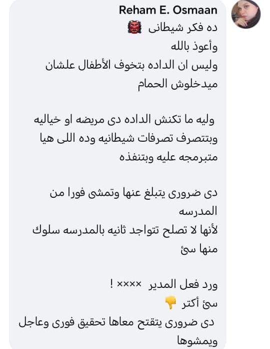 وأوضحت، أن ما يزيد من مخاوف الأهالي هو تداول روايات تكررت على لسان أكثر من عشرين طفلًا، مؤكدة أنها توجهت لمدير المدرسة الذي أفاد بأنه سيتحدث مع الدادة، دون اتخاذ إجراءات فورية، على حد وصفها. وأضافت أنها لاحظت وجود الدادة بمكتب المدير الذي وجّه لها تعليمات بعدم الاقتراب من الحمامات أثناء اليوم الدراسي والاكتفاء بتنظيفها بعد انتهاء اليوم.