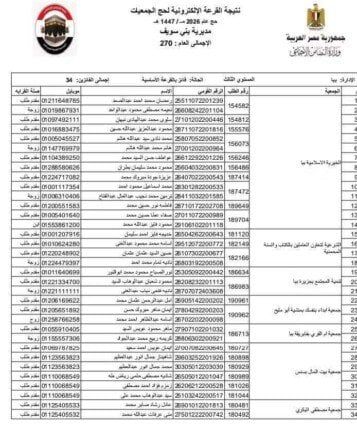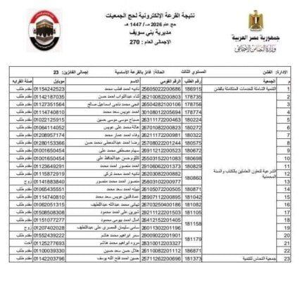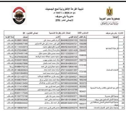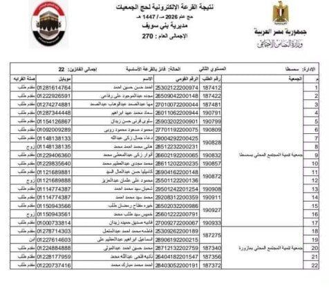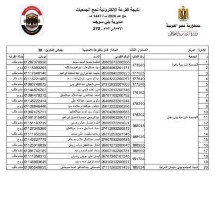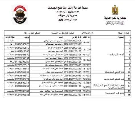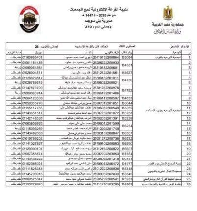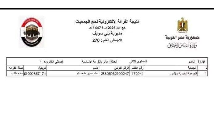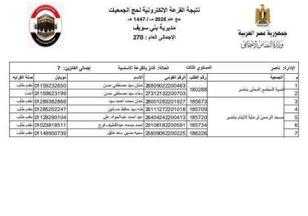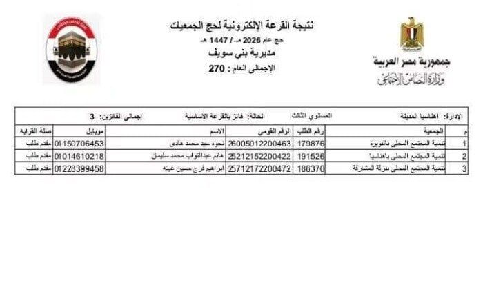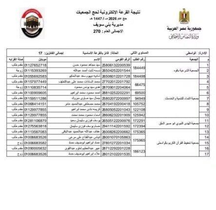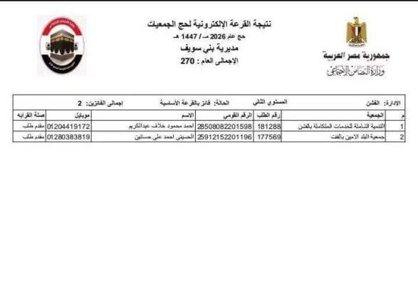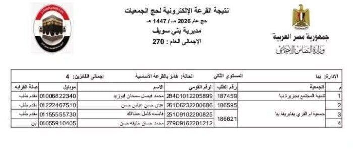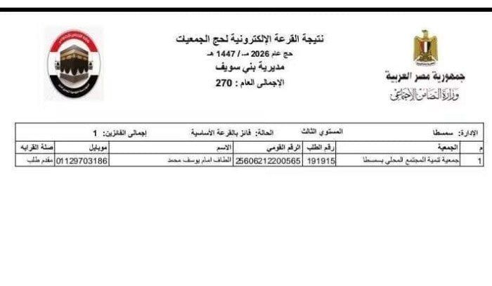 اعلنت مديرية التضامن الاجتماعي بمحافظة بني سويف، اليوم السبت، أسماء الفائزين بقرعة حج الجمعيات الأهلية لموسم 2026، وذلك بعد إجراء القرعة الرسمية بالوزارة.
