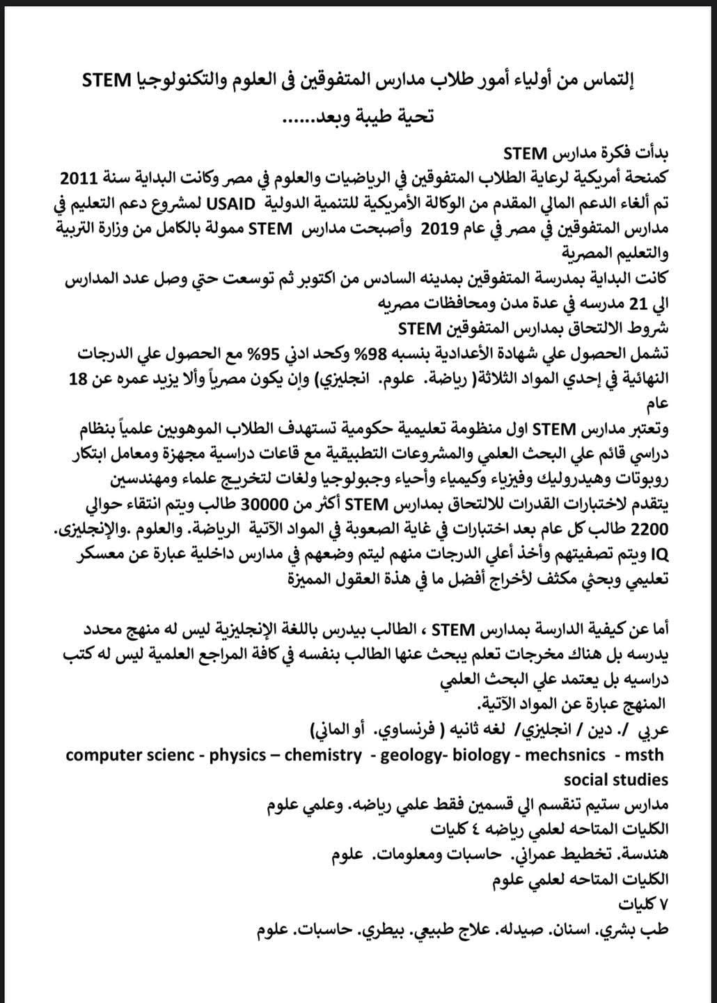 واختتم أولياء الأمور التماسهم بالتأكيد على ثقتهم في استجابة المسؤولين، مشيرين إلى أن دعم طلاب مدارس STEM يمثل استثمارًا مباشرًا في مستقبل مصر العلمي والتكنولوجي، ويسهم في تعزيز قدراتها في مجالات الابتكار والبحث المتقدم.
