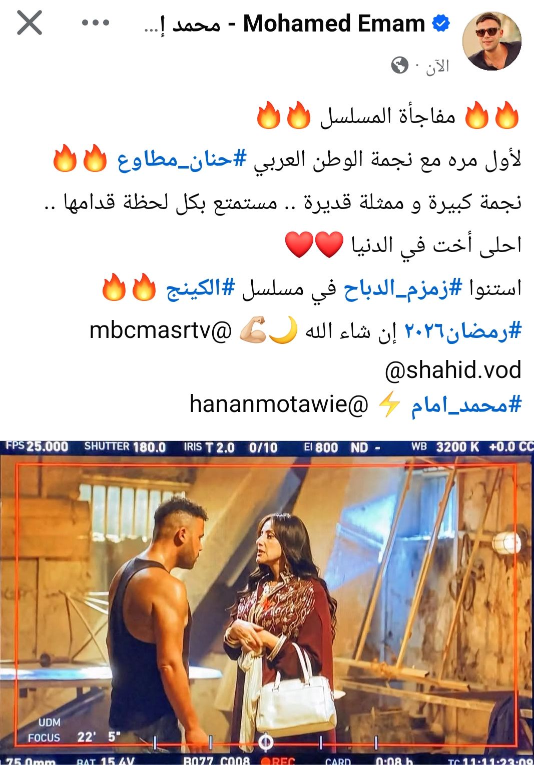 ونشر محمد إمام، صورة تجمعه بحنان مطاوع من كواليس تصوير مسلسله، عبر حسابه الشخصي بموقع التواصل الاجتماعي فيسبوك.